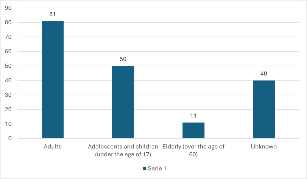 It should be noted that the Database not only contains the profiles of those whose names were identified but also those whose first and last names could not be established. Such victims, both individuals and groups of individuals, were registered collectively as nameless victims, with currently 1,642 such profiles. Accordingly, these are groups of individuals ranging from two to 50 people, depending on the information provided. Such victims were registered, for example, in the following way: “Four young people from the village of Novye Aldy detained on June 4, 2006”. Nameless individual victims were registered in a similar manner: “A young teacher killed as a result of a mine explosion in a village. Chiri-Yurt, October 2000”. Profiles of nameless victims were created with sufficient to register a profile and specific information about the victim and the violation. Due to the absence of any individualized information, however, they are deemed to be unsuitable for the verification process and are therefore not included in the number of victims when generating statistics on the victims of the war in the Chechen Republic.