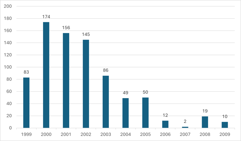 The Database contains information on at least 921 individuals whose property was destroyed or partially damaged during the conflict in the North Caucasus.[4] Of this number, incidents against 753 individuals occurred in the Chechen Republic. As reflected in chart 1,[5] the majority of the cases occurred in the early 2000s, which strongly correlates with the number of bombings and special operations that took place in the Republic during that period.[6]