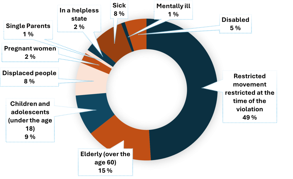 Among those whose property was damaged or destroyed in Chechnya, at least 305 belonged to vulnerable groups. Such victims were persons who had their freedom of movement restricted at the time of the violation (227 victims); elderly persons (71 victims); minors (43 victims); internally displaced persons (35 victims); persons suffering from disabilities (23 victims), persons in a helpless state (nine victims); pregnant women (eleven victims); and persons with mental disorders (four victims) (see chart 2).[7]