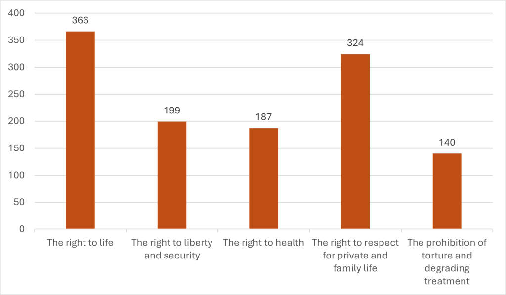 [15]Some of the victims may have been subjected to many violations simultaneously or over a period of time. The graph shows the most common violations against victims.